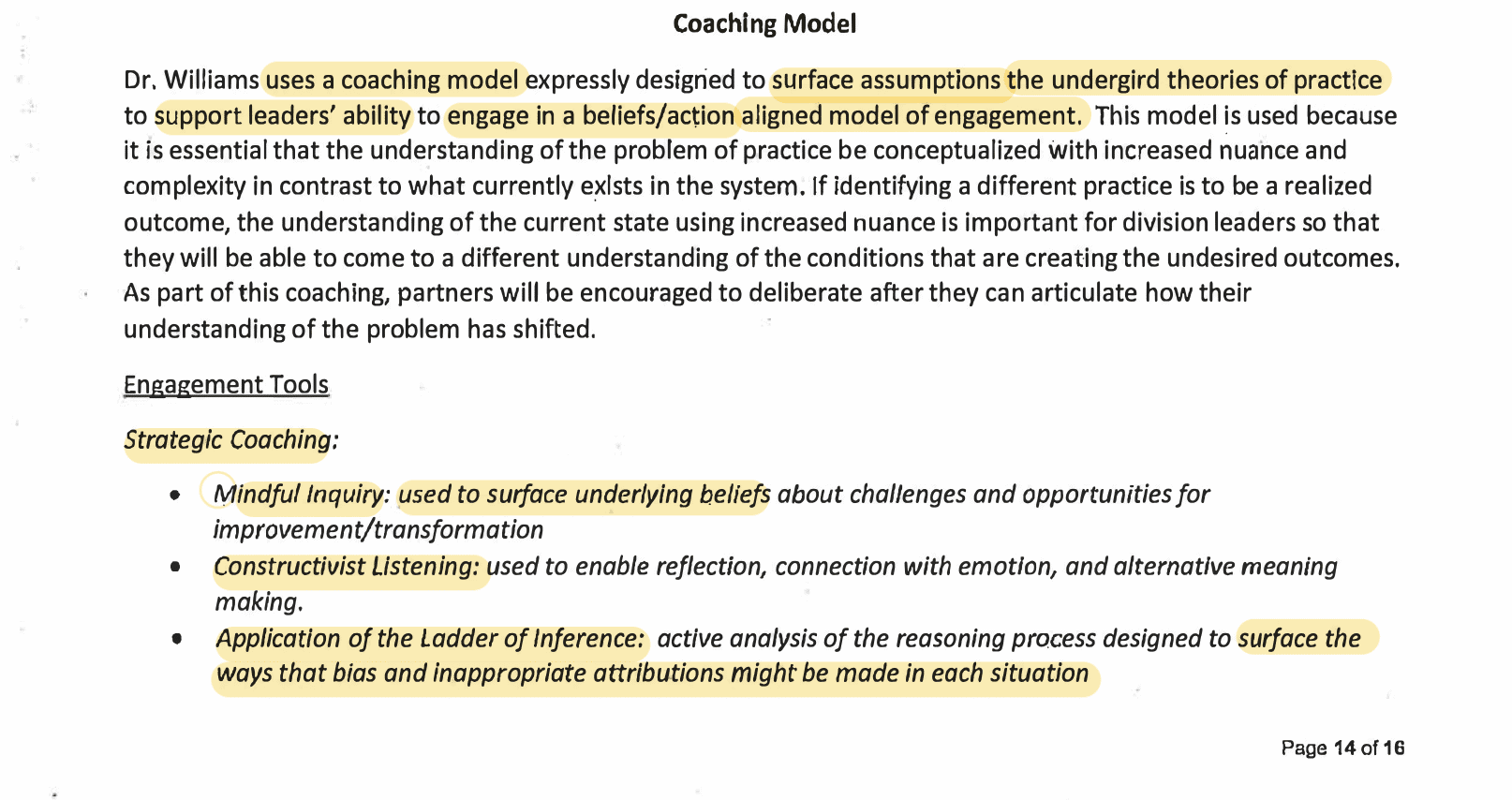 - “Objective 1” is headlined “Transformative Coaching.” The proposal notes that Fairfax County Public Schools “will identify a team of leaders to engage in coaching with Dr. Williams.”